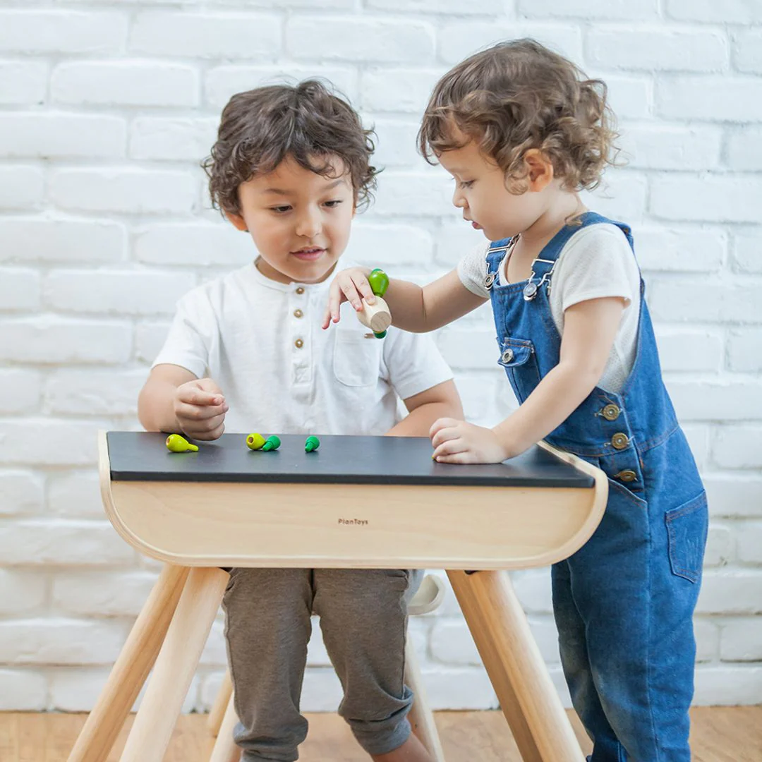 - Features 2 compartments for storage and a chalkboard desktop that toddlers can draw or write on